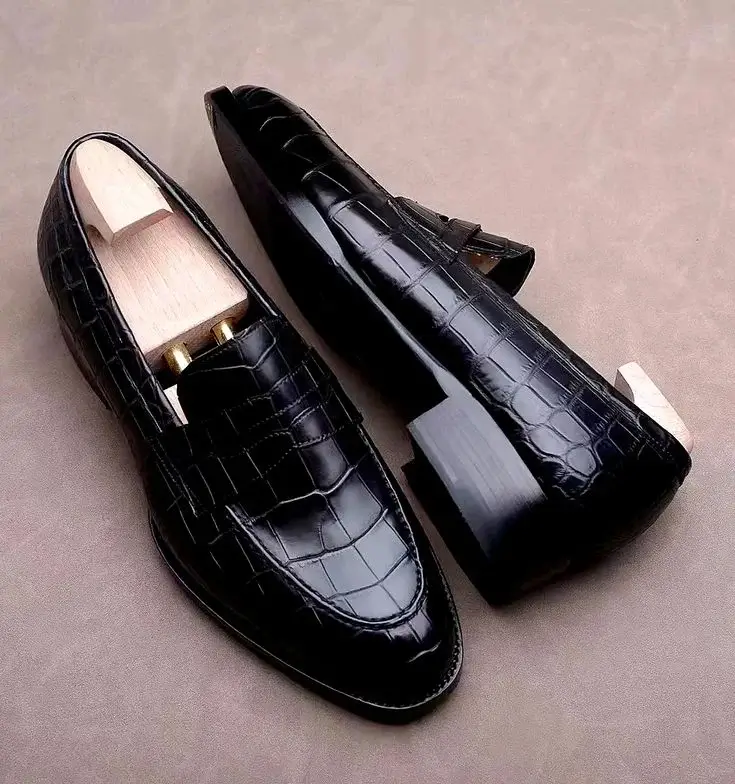Black crocodile textured loafers.